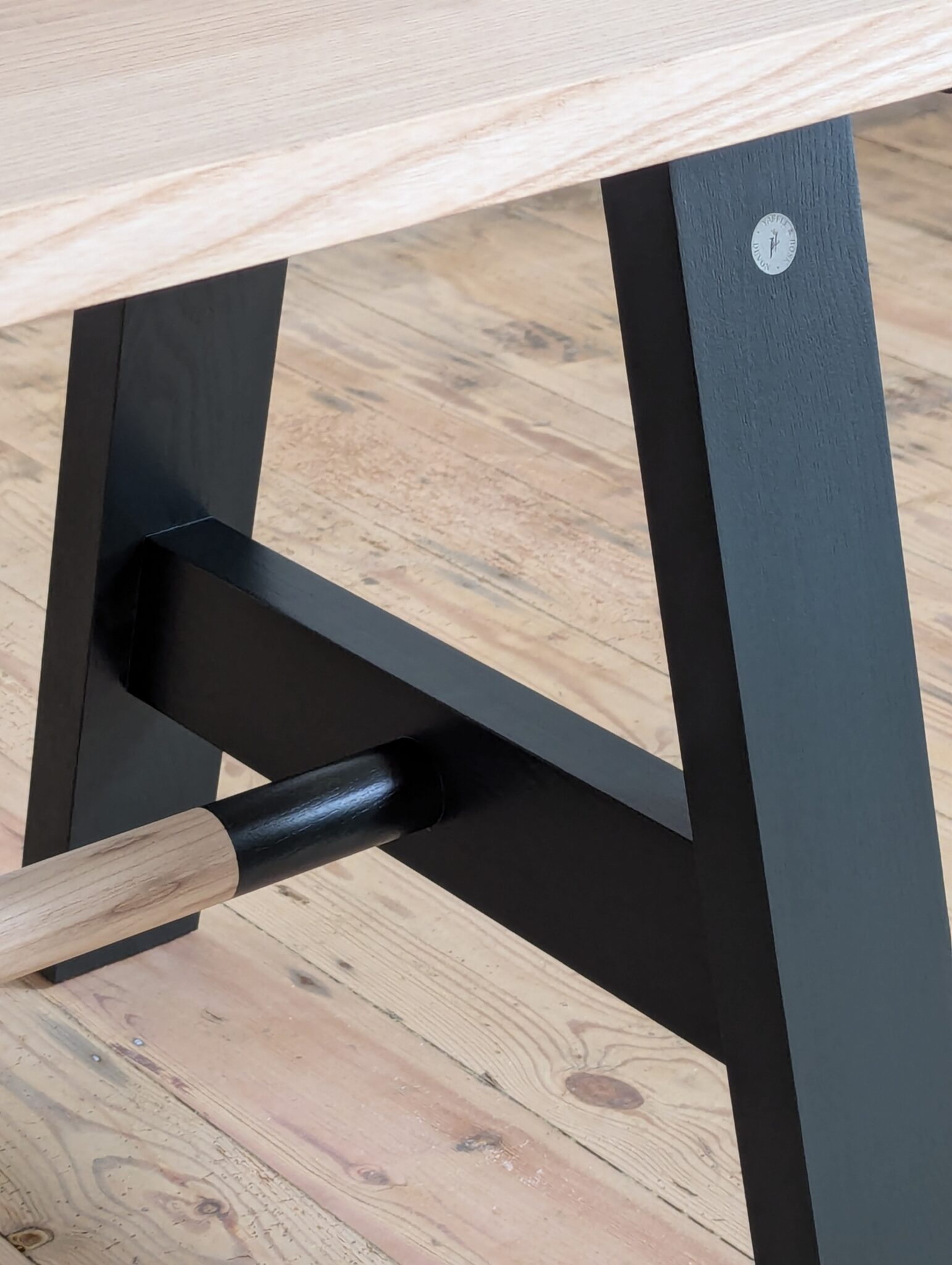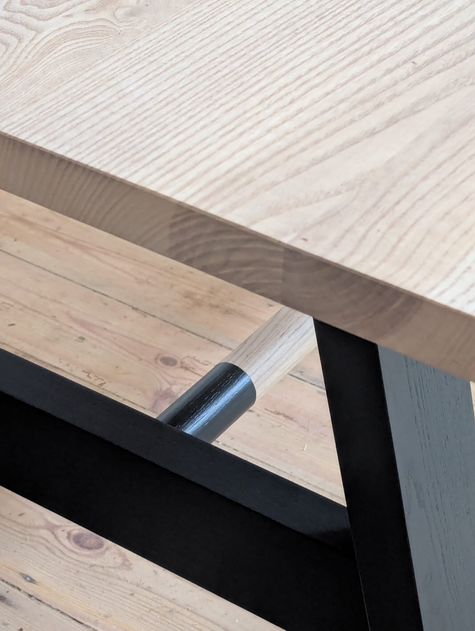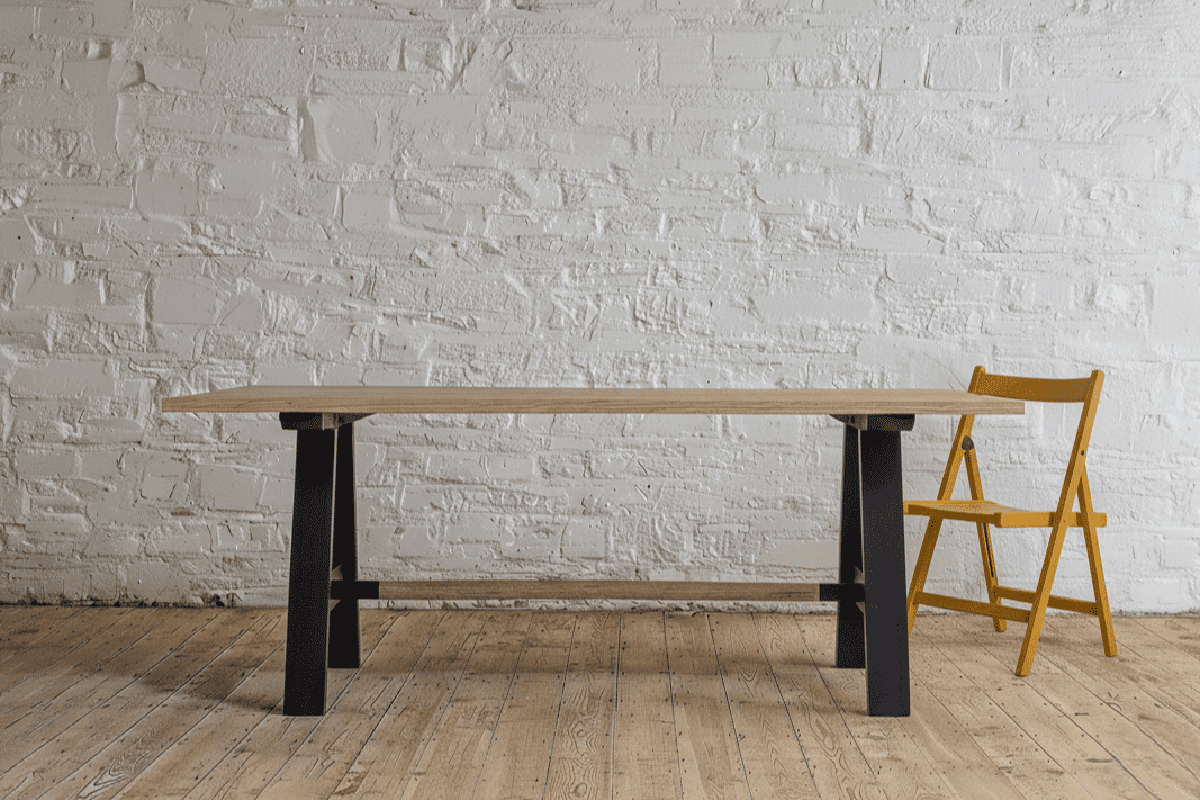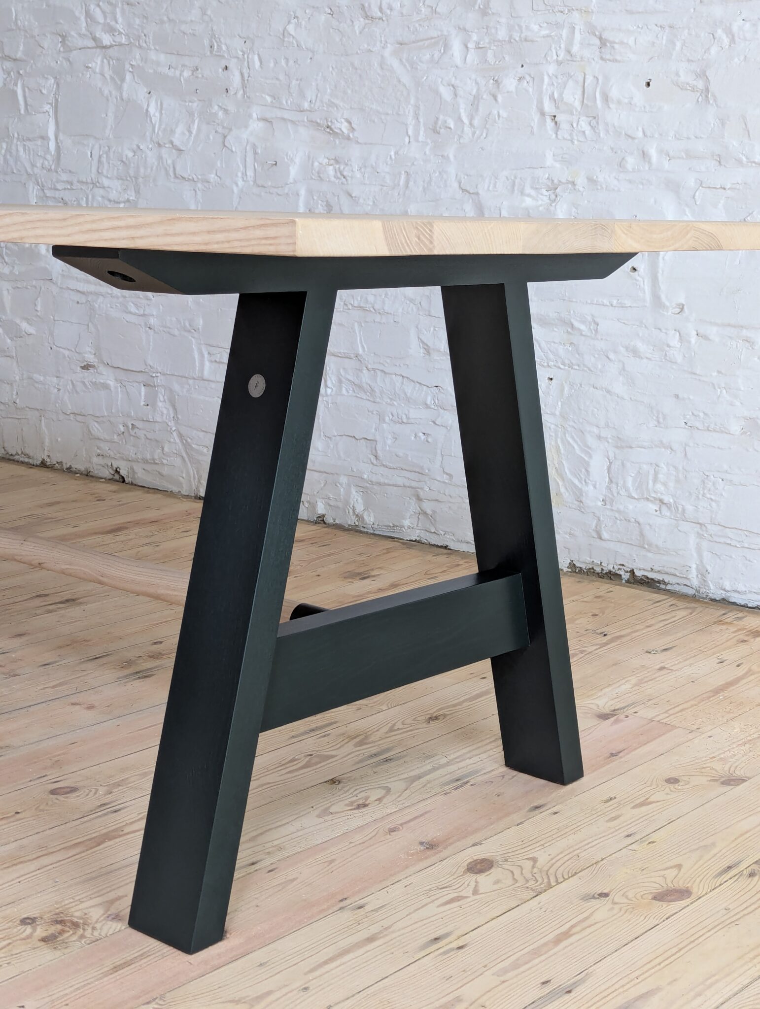 A traditional braced A frame with dowelled stretcher. We use solid 4”x2” ash, hand jointed and finished to match your top.